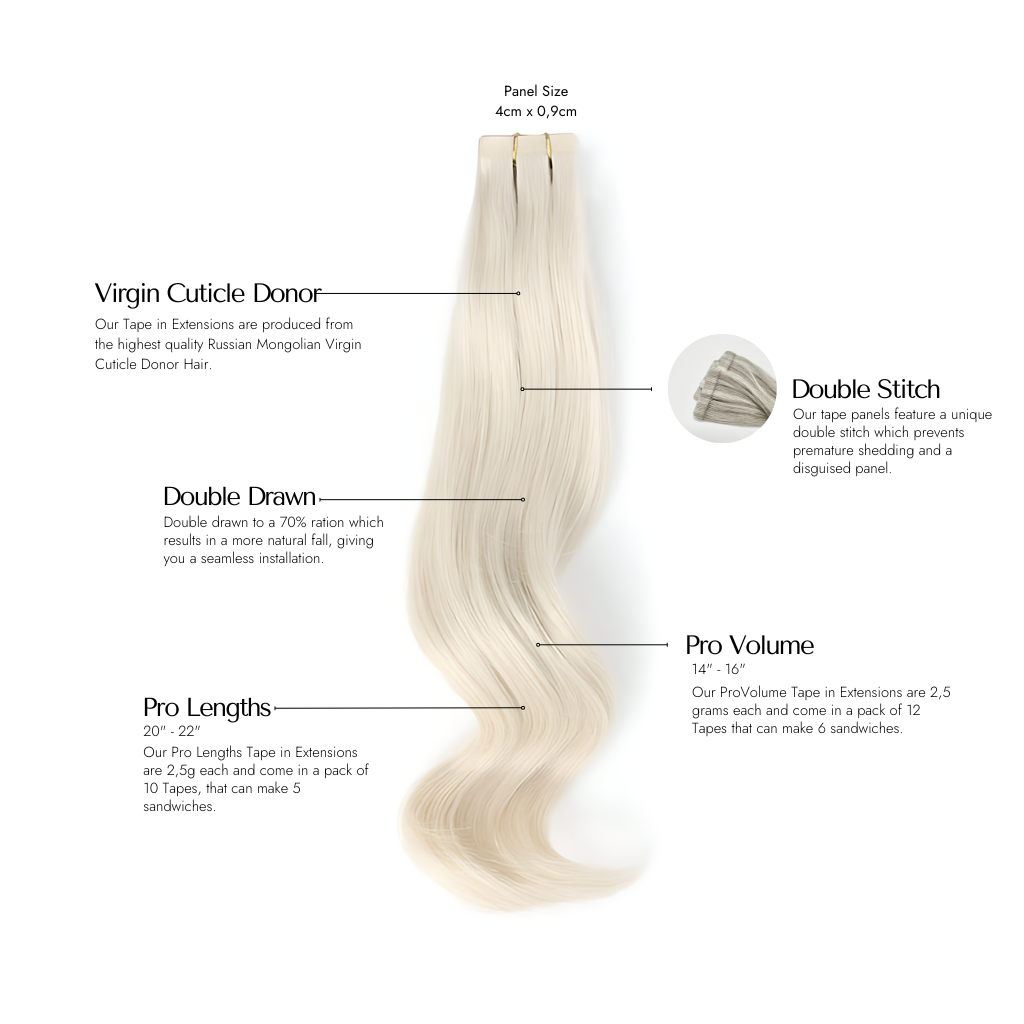 Onlypro tape-in extensions are reusable pre-taped made of 100% double drawn Remy human hair. Each tape tab has double stitch with anti-shedding technology which results in longer lasting and durable tape in extensions.